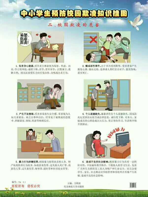 校园,尤其是中小学校园,应该是最阳光、最快乐、最温情的地方。但是近些年来,校园恶性欺凌事件的屡屡发生,让这个阳光之地成为家长、学校、社会、乃至国家最关注的地方。各类暴力事件,也给中小学生弱小的心灵蒙上一层阴影。加强中小学生防欺凌教育,事关亿万中小学生的身心健康和全面发展,事关千家万户的幸福和社会和谐稳定,事关中华民族的未来和伟大复兴。为此,我们根据教育部相关文件精神编写了《中小学生预防校园欺凌知识挂图》。